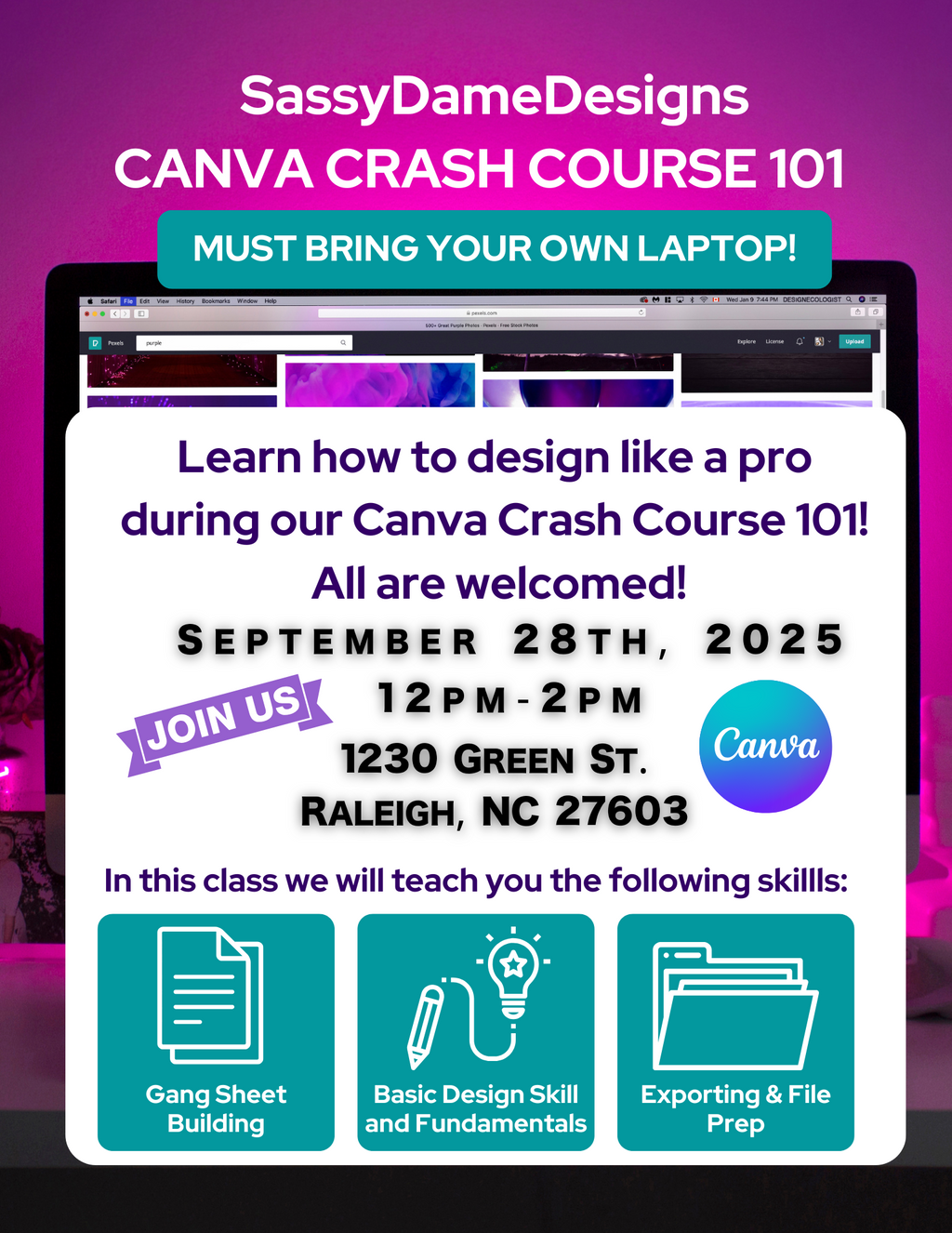 By the end of the class, you’ll leave with the skills and confidence to design with ease, whether for business or personal projects.