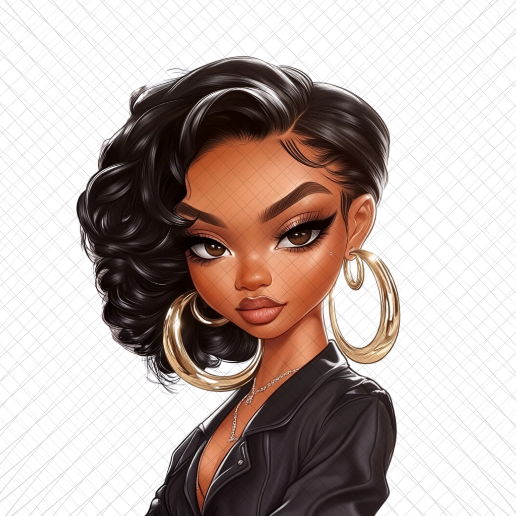 This sleek and stylish PNG file features a stunning African-American woman exuding confidence and sophistication. Her flawless, voluminous curls, bold arched brows, and striking makeup highlight her fierce personality. She is adorned with large gold hoop earrings and a delicate necklace, perfectly complementing her edgy black leather jacket.