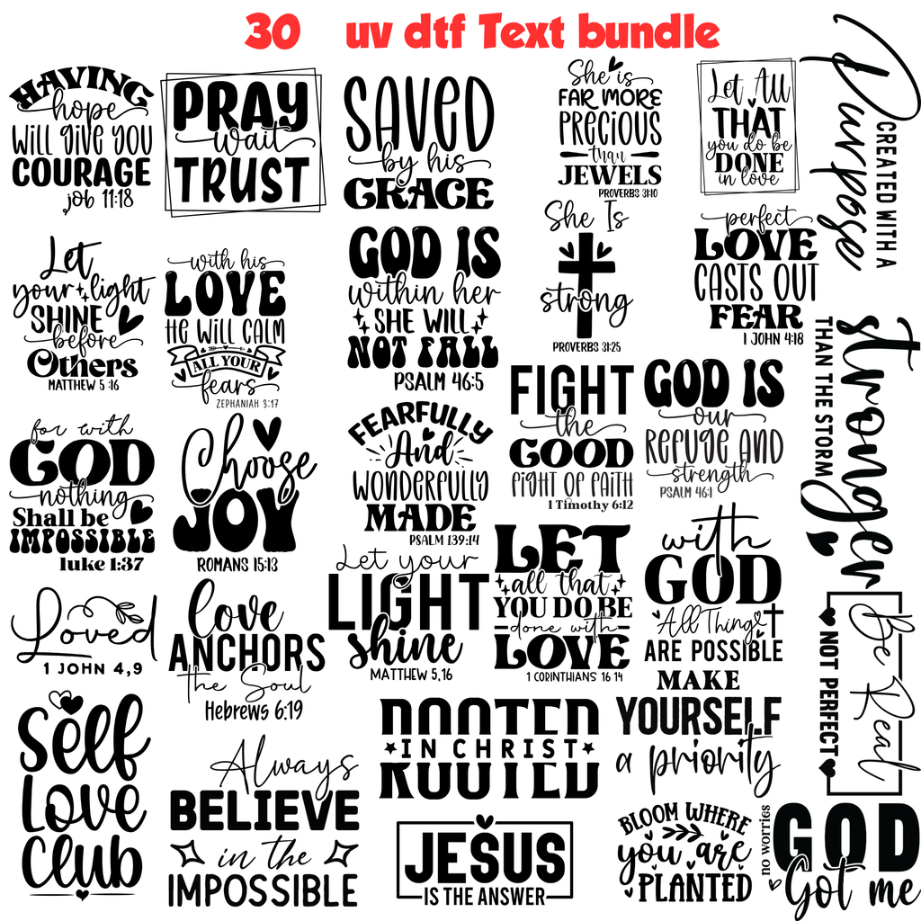 This bundle includes stunning UV DTF stickers featuring cute Christian text. Perfect for journals, tumblers, laptops, and DIY gifts!